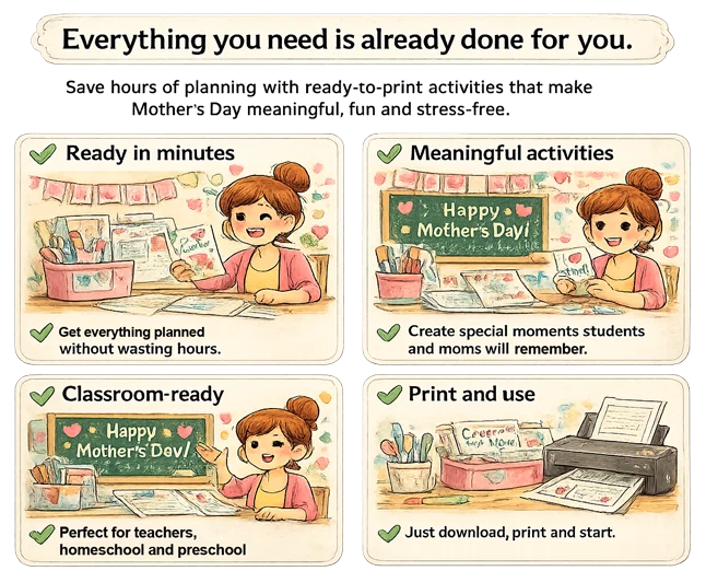 Everything is ready for you: meaningful printables, crafts and keepsakes designed to make Mother’s Day special without the stress. Just download, print and use.